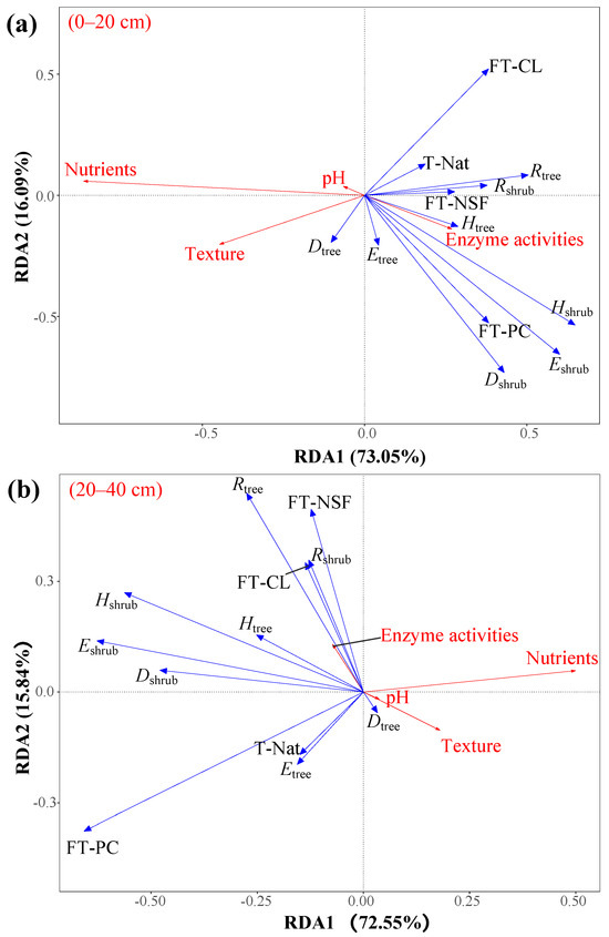 Redundancy analysis of soil characteristics with plant diversity, forest type, and treatment. (a) in the 0–20 cm soil layer; (b) in the 20–40 cm soil layer. Note: Red lines indicate response variables, and blue lines indicate explanatory variables. Nutrients refer to the principal components with eigenvalues greater than 1 obtained from principal component analysis (PCA) based on soil nutrient indicators (Soil organic carbon [SOC], Total nitrogen [TN], Total Phosphorus [TP], Total Potassium [TK], Alkaline hydrolyzable nitrogen [AN], Available Phosphorus [AP], Available Potassium [AK]). Texture refers to the principal components with eigenvalues greater than 1 obtained from PCA based on soil particle composition (Gravel, Coarse sand [CS], Fine sand [FS], Silt, Clay). Enzyme activities refer to the principal components with eigenvalues greater than 1 obtained from PCA based on soil enzyme activity indicators (Urease [URE], Cellulase [Cx], and Acid phosphatase [ACP]). Rtree, Htree, Dtree, and Etree refer to the Patrick index, Shannon–Wiener index, Simpson index, and Pielou index of the tree layer, respectively. Rshrub, Hshrub, Dshrub, and Eshrub refer to the Patrick index, Shannon–Wiener index, Simpson index, and Pielou index of the shrub layer, respectively. FT-NSF: Forest type—Natural secondary forest, FT-CL: Forest type—Cunninghamia lanceolata, FT-PC: Forest type—Pinus caribaea, T-Nat: Treatment—Natural, CL: Cunninghamia lanceolata plantation, CL-G: Cunninghamia lanceolata plantation (Girdling), PC: Pinus caribaea plantation, PC-G: Pinus caribaea plantation (Girdling), and NSF: Natural secondary forest.