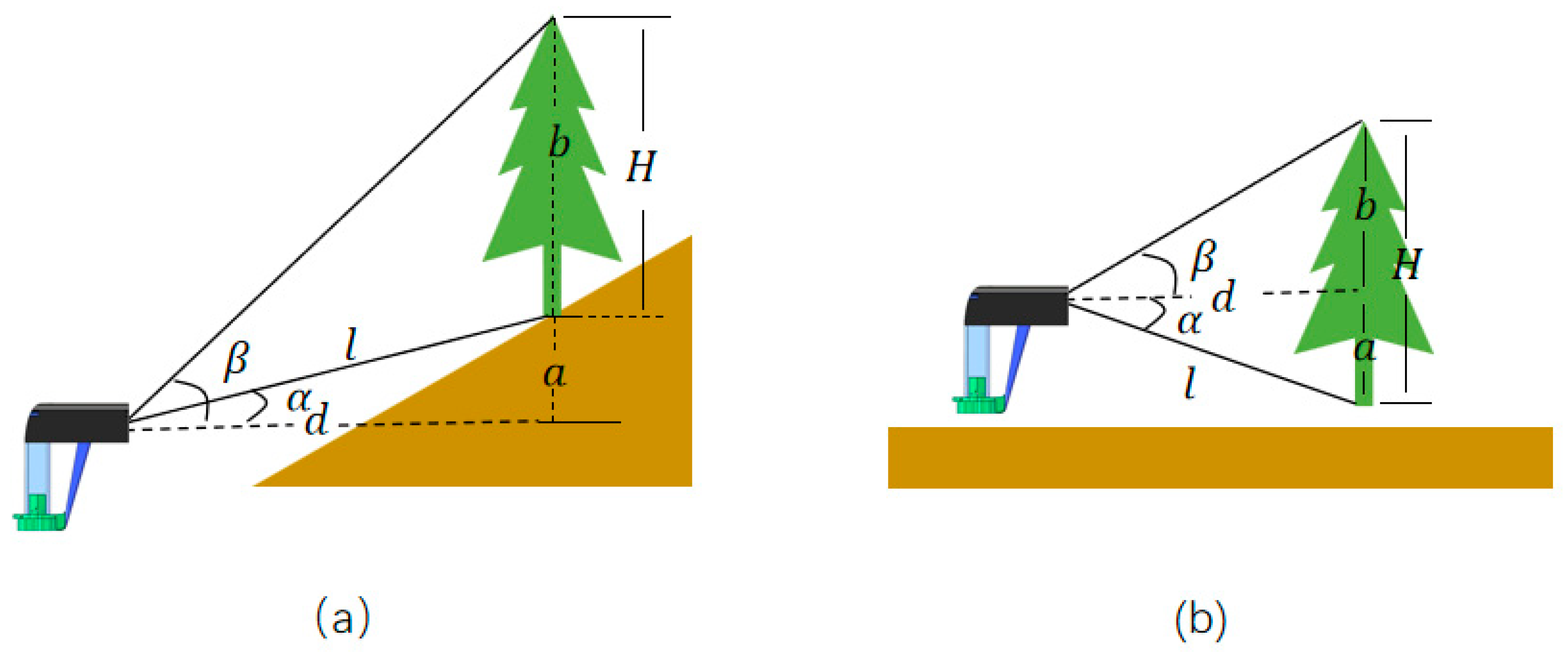 - Yu, D.; Feng, Z.; Cao, Z.; Jiang, J. Error analysis of measuring diameter at breast height and tree height and volume of standing tree by total station. Trans. Chin. Soc. Agric. Eng. 2016, 32, 160–167. [Google Scholar]