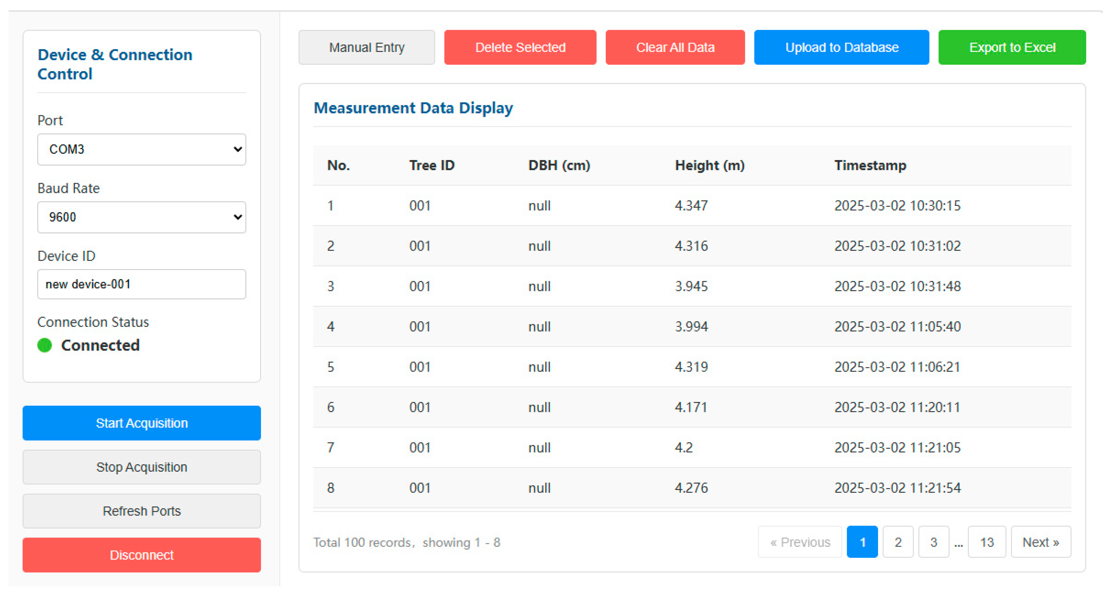 - Zhang, Q.; Sun, Y.; Zheng, X.; Zhang, S.; Fang, L. Development of a Real-Time Continuous Measurement System for Tree Radial Direction. Forests 2023, 14, 1876. [Google Scholar] [CrossRef]