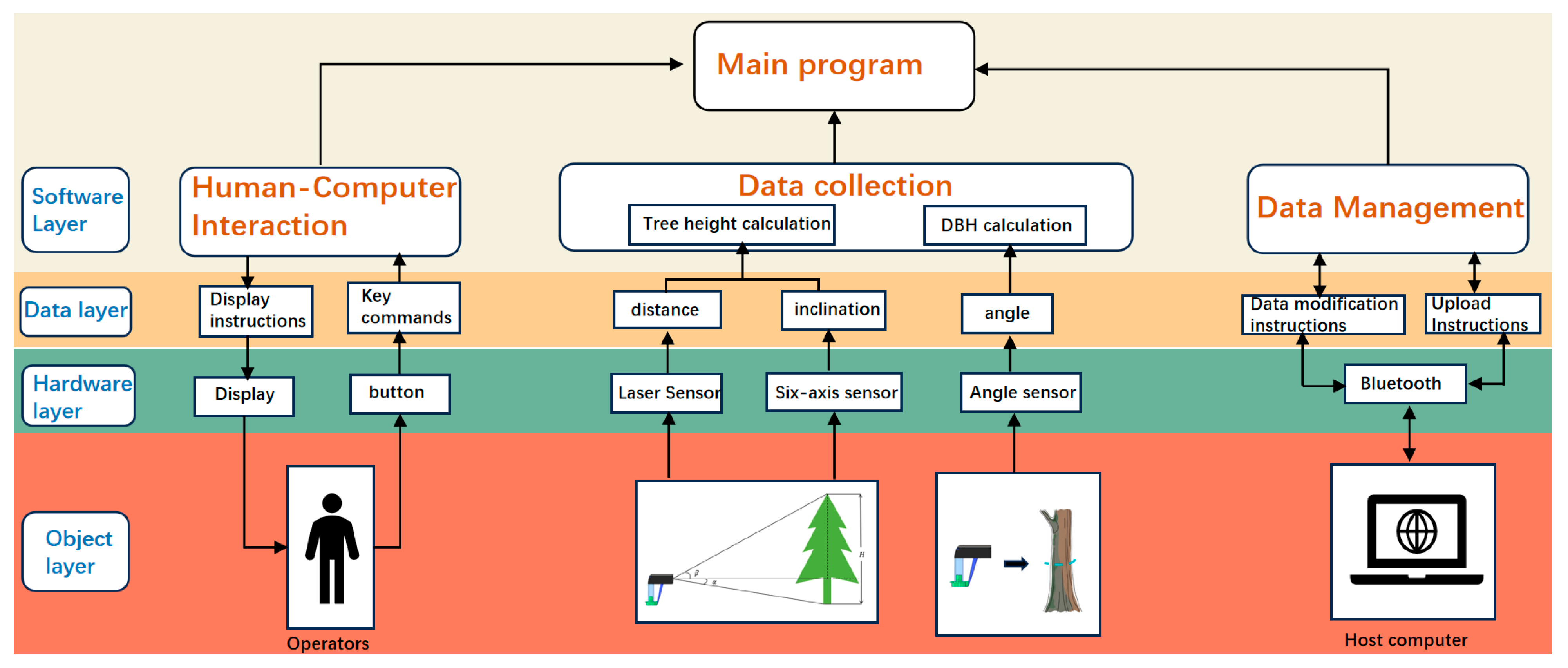 Xu, A.; Zheng, X.; Zhao, K.; Zhang, S.; Sun, L.; Fang, L. Development of an Integrated Forestry Survey Device for Tree Height and DBH. Forests 2025, 16, 1529. https://doi.org/10.3390/f16101529