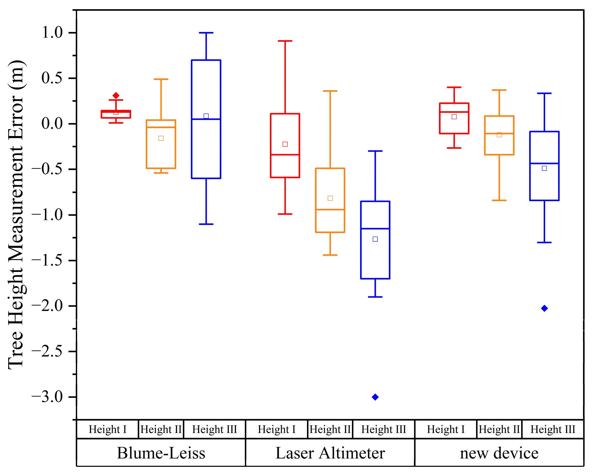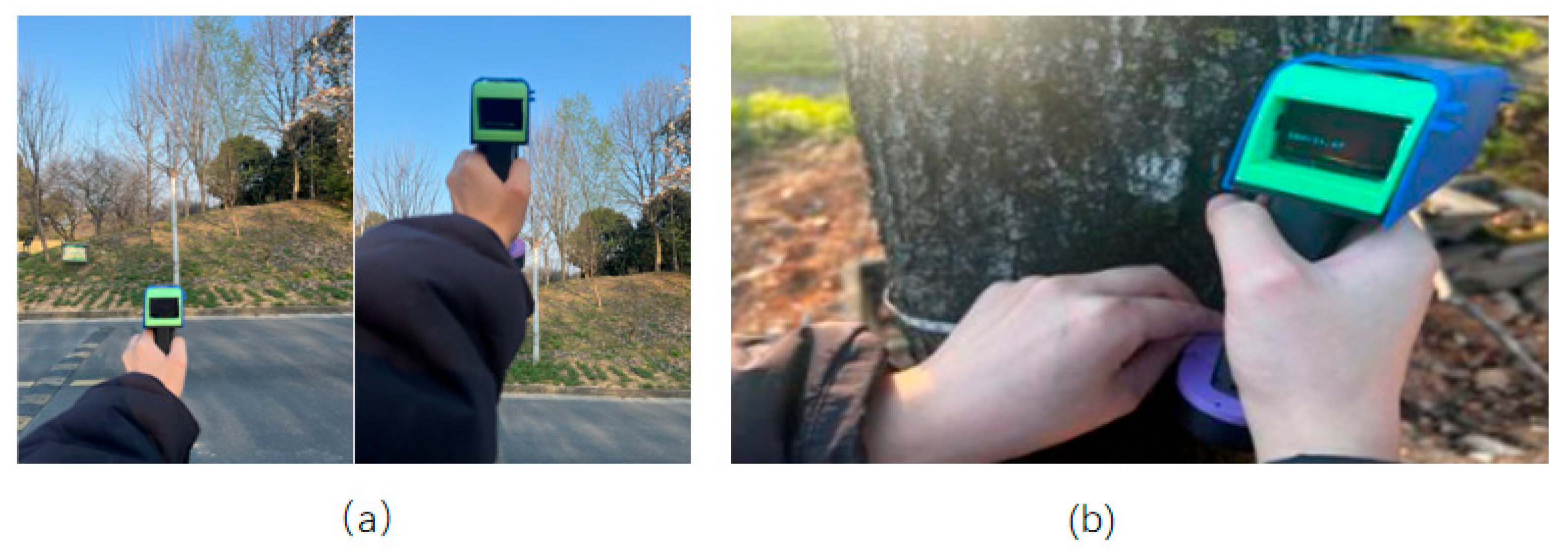 - Li, S.; Fang, L.; Sun, Y.; Xia, L.; Lou, X. Development of measuring device for diameter at breast height of trees. Forests 2023, 14, 192. [Google Scholar] [CrossRef]