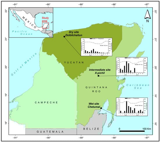Geographic location of the three study sites in the Yucatán Peninsula, Mexico: dry site (Dzibilchaltún National Park; 21°05′ N, 89°35′ W; MAP 700 mm), intermediate site (X-pichil forest reserve; 19°41′ N, 88°22′ W; MAP 1000 mm), wet site (ECOSUR forest area in Chetumal; 18°32′ N, 88°15′ W; MAP 1200 mm). Ombrothermic diagrams correspond to the sampling period at each site.