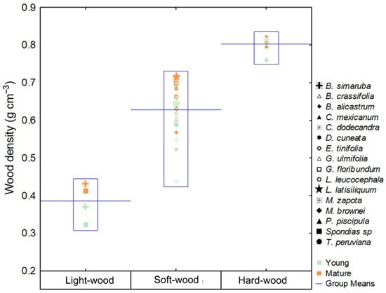 Wood density (WD, g cm−3) groups for 16 tree species considering two diameter classes: young (<10 cm DBH) and mature (>20 cm DBH). Groups: light-wood (WD < 0.50 g cm−3), soft-wood (0.50–0.74 g cm−3), and hard-wood (>0.75 g cm−3). Error bars indicate ± SE.