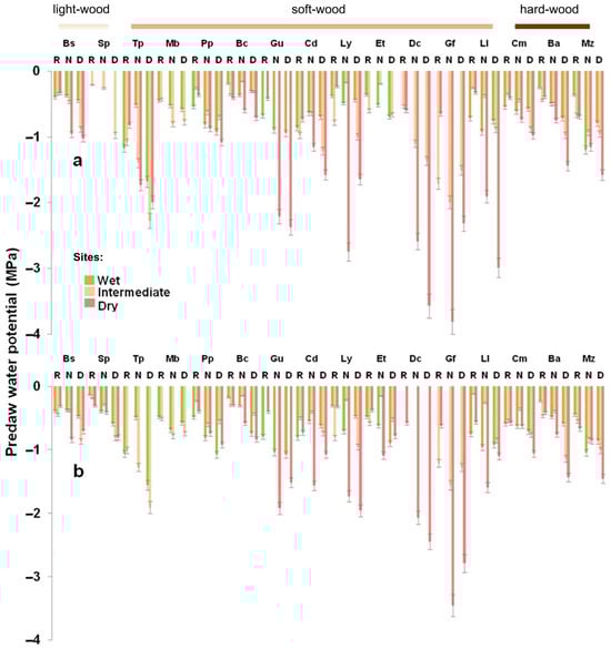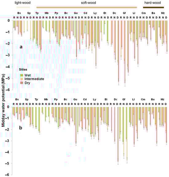 Midday water potential (Ψmd, MPa) for 16 tree species during the rainy season (R), nortes (N), and dry season (D). (a) Young stage; (b) mature stage. Values are mean ± SE, n = 319.