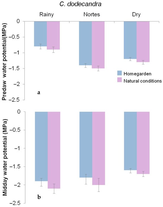 Water potential comparison of Cordia dodecandra, homegarden vs. natural conditions. (a) Predawn water potential (Ψpd), (b) midday water potential (Ψmd); error bars represent standard errors.