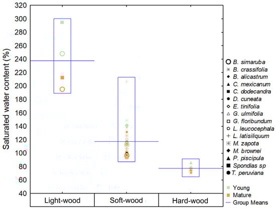 Saturated water content (SWC, %) for 16 tree species grouped by wood density classes and considering two diameter classes: young (<10 cm DBH) and mature (>20 cm DBH). Values are mean ± SE.