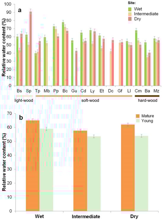 Relative water content (RWC, %) for 16 tree species of the Yucatán Peninsula. (a) Rainy season comparison among sites; (b) comparison between diameter classes and sites. Values are mean ± SE.