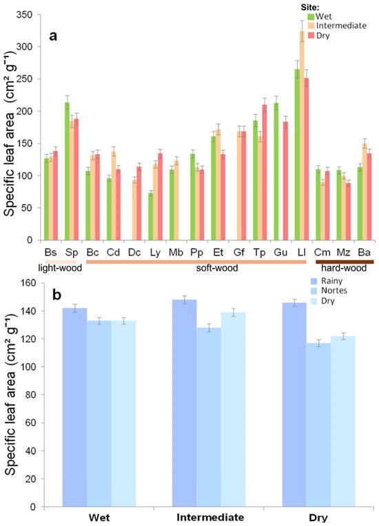 Specific leaf area (SLA) recorded for 16 tree species. (a) Rainy season comparison among sites. (b) comparison between seasons and sites. Values are mean ± SE.
