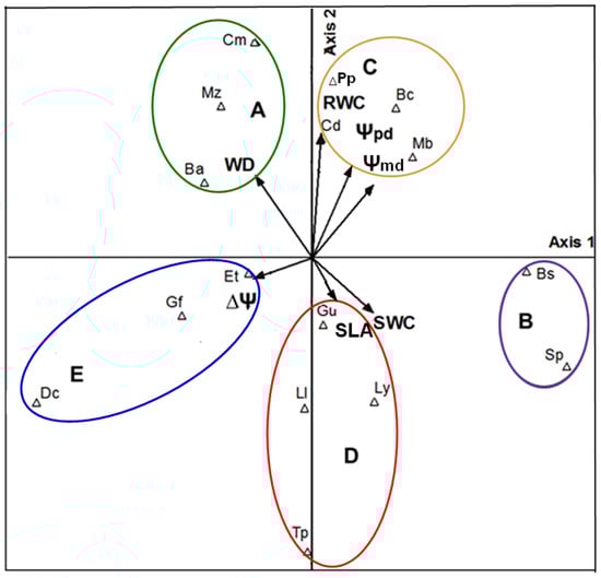 Loadings of the PCA are provided in Tables S1 and S2 (Supplementary Materials), highlighting ΔΨ and SWC as the strongest contributors to the first axis and RWC and SLA to the second axis.