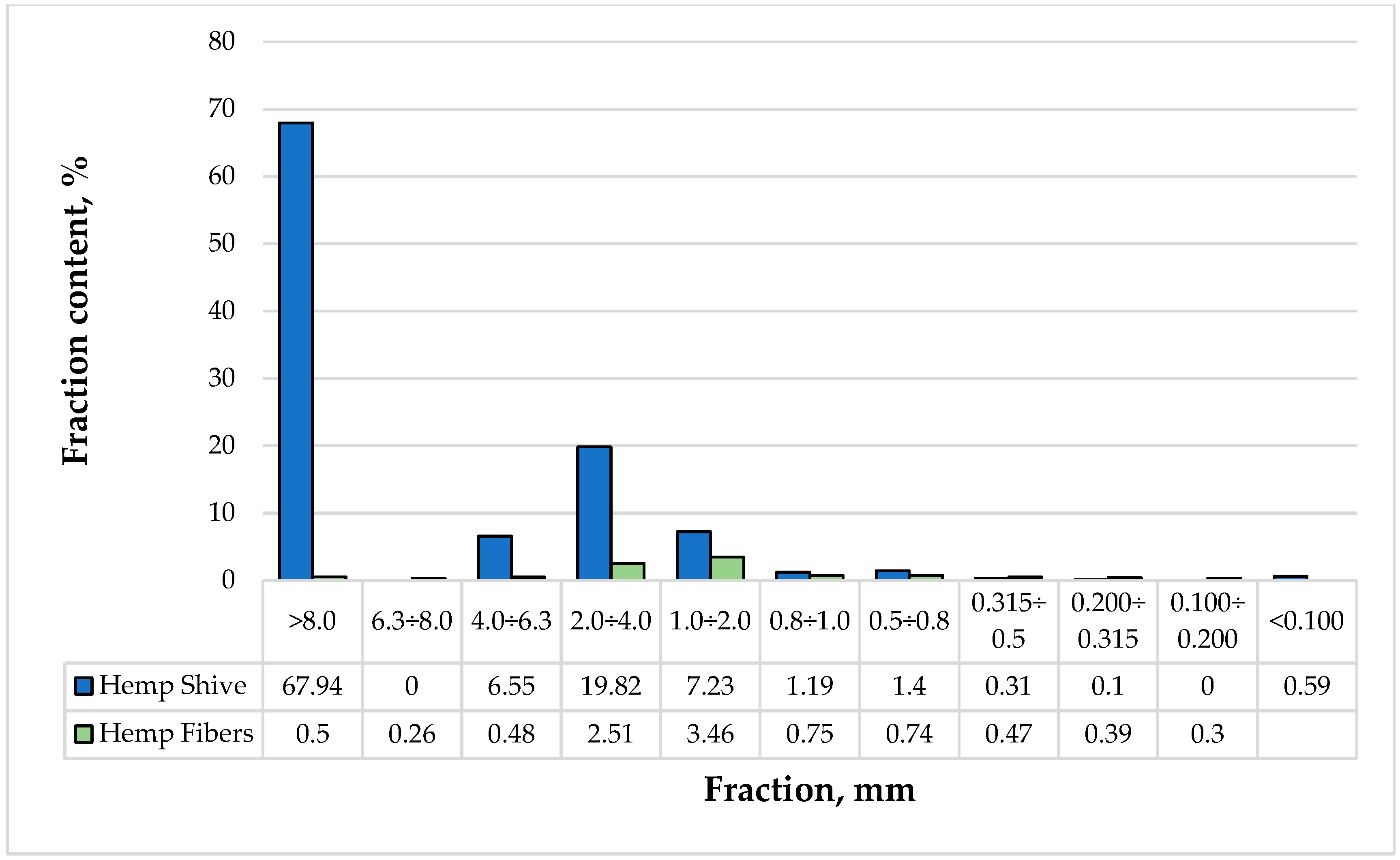Figure 1) revealed that the dominant fraction in the hemp shives exceeded 8 mm, classifying it as coarse material suitable for core layer application. In contrast, the processed stalk fibers exhibited a more uniform grain profile, with the majority of particles falling within the 1.0–4.0 mm range.