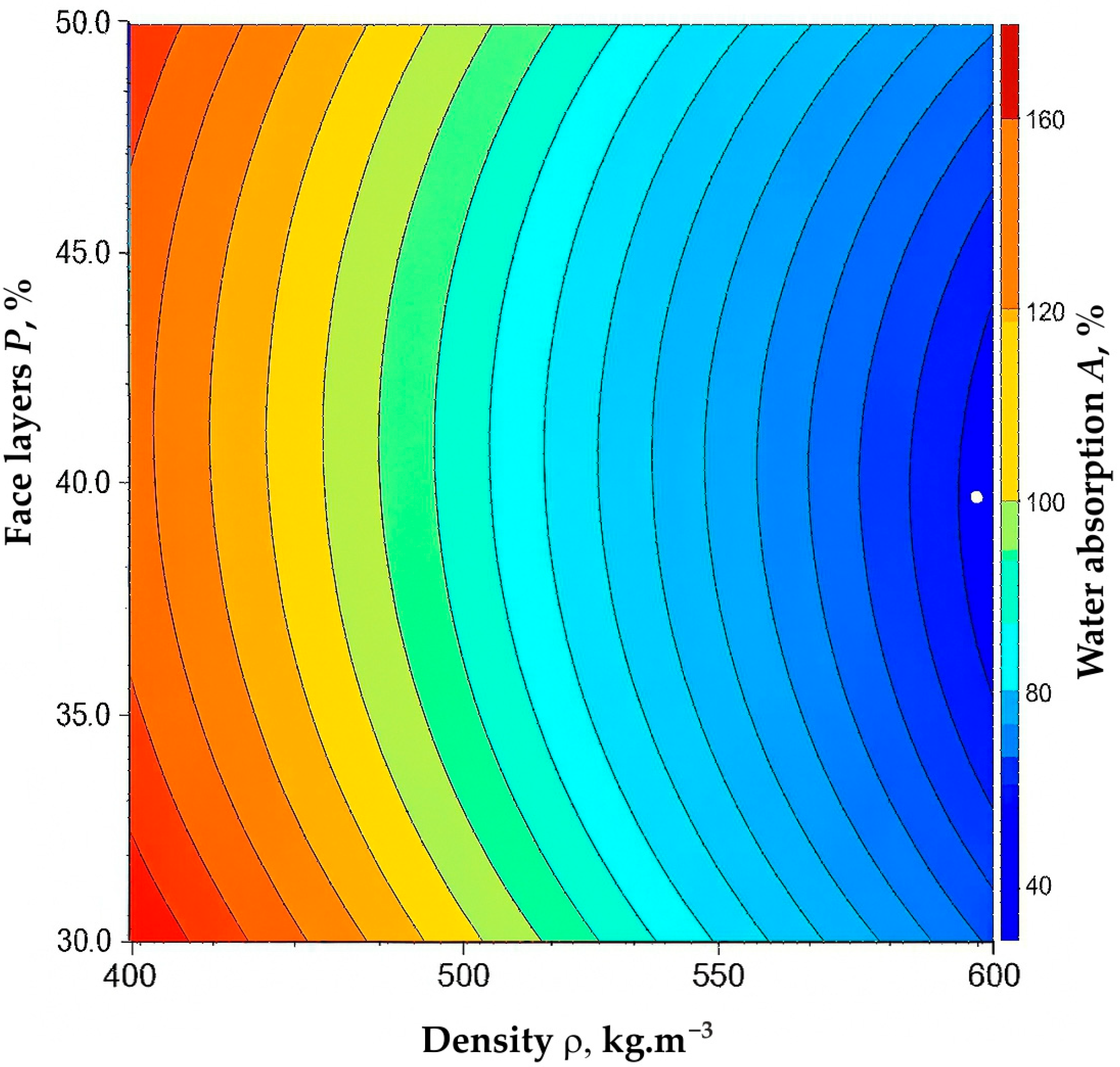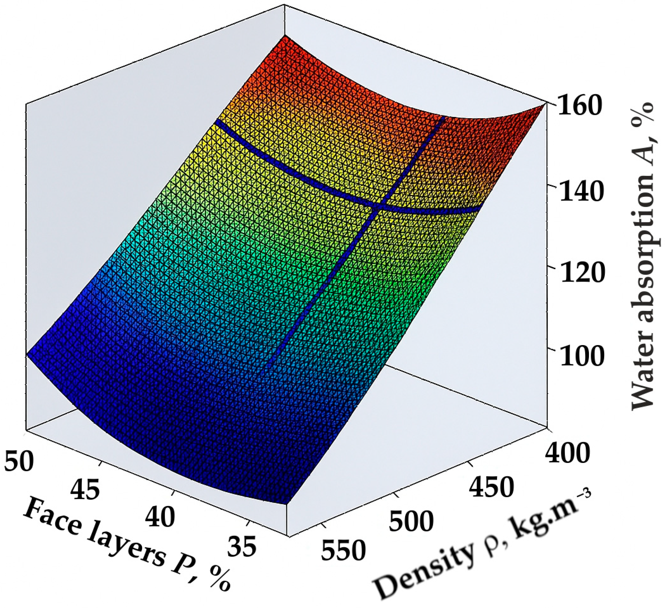 P) follows a quadratic (nonlinear) pattern. Up to around 37%, increasing the amount of face-layer material (made of hemp fibers) significantly improves water resistance. This is likely due to better consolidation of the top and bottom surfaces, which act as barriers to moisture ingress. However, as the face-layer share increases beyond 42%, a reverse effect is observed: water absorption rises again (