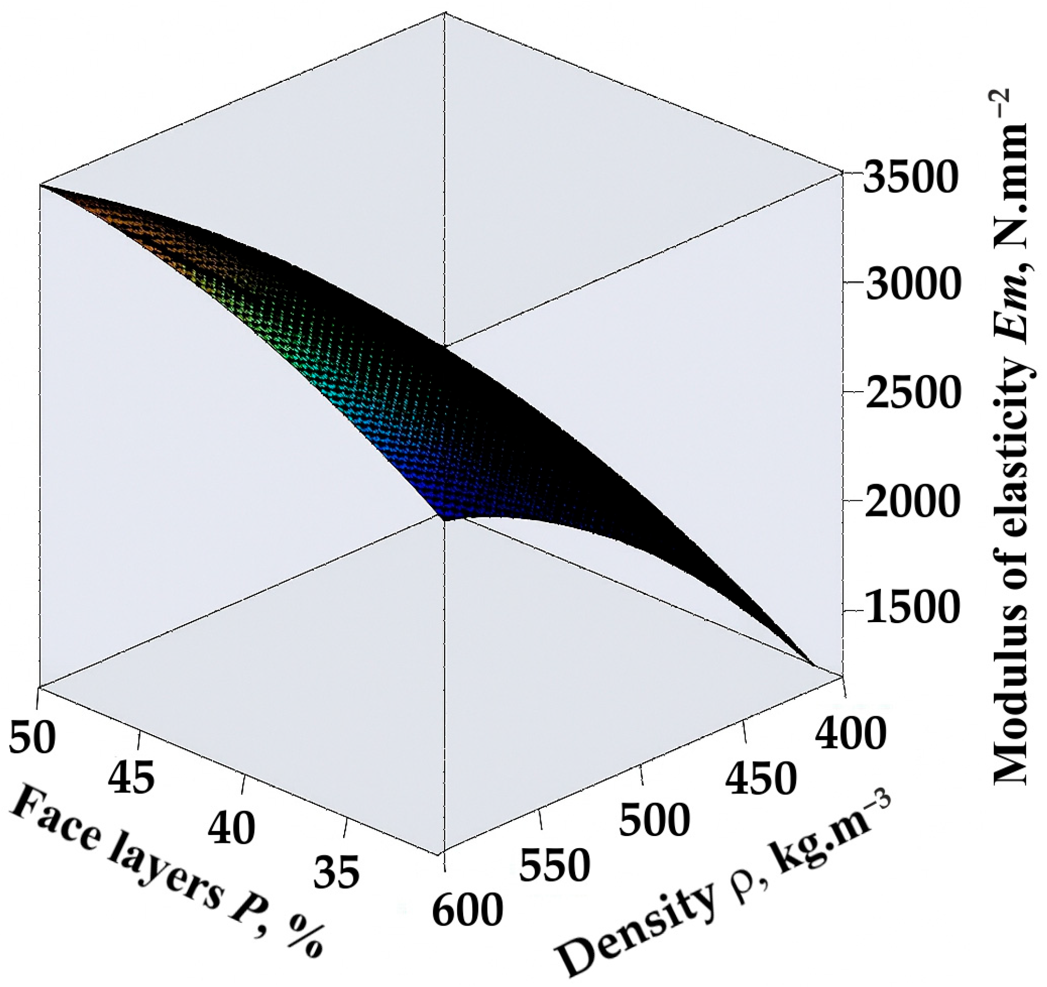 The modulus of elasticity (MOE) is a key parameter for the structural performance of composite panels, especially in applications such as furniture manufacturing, where both rigidity and lightweight design are critical. The influence of board density and face layer content on MOE is presented in