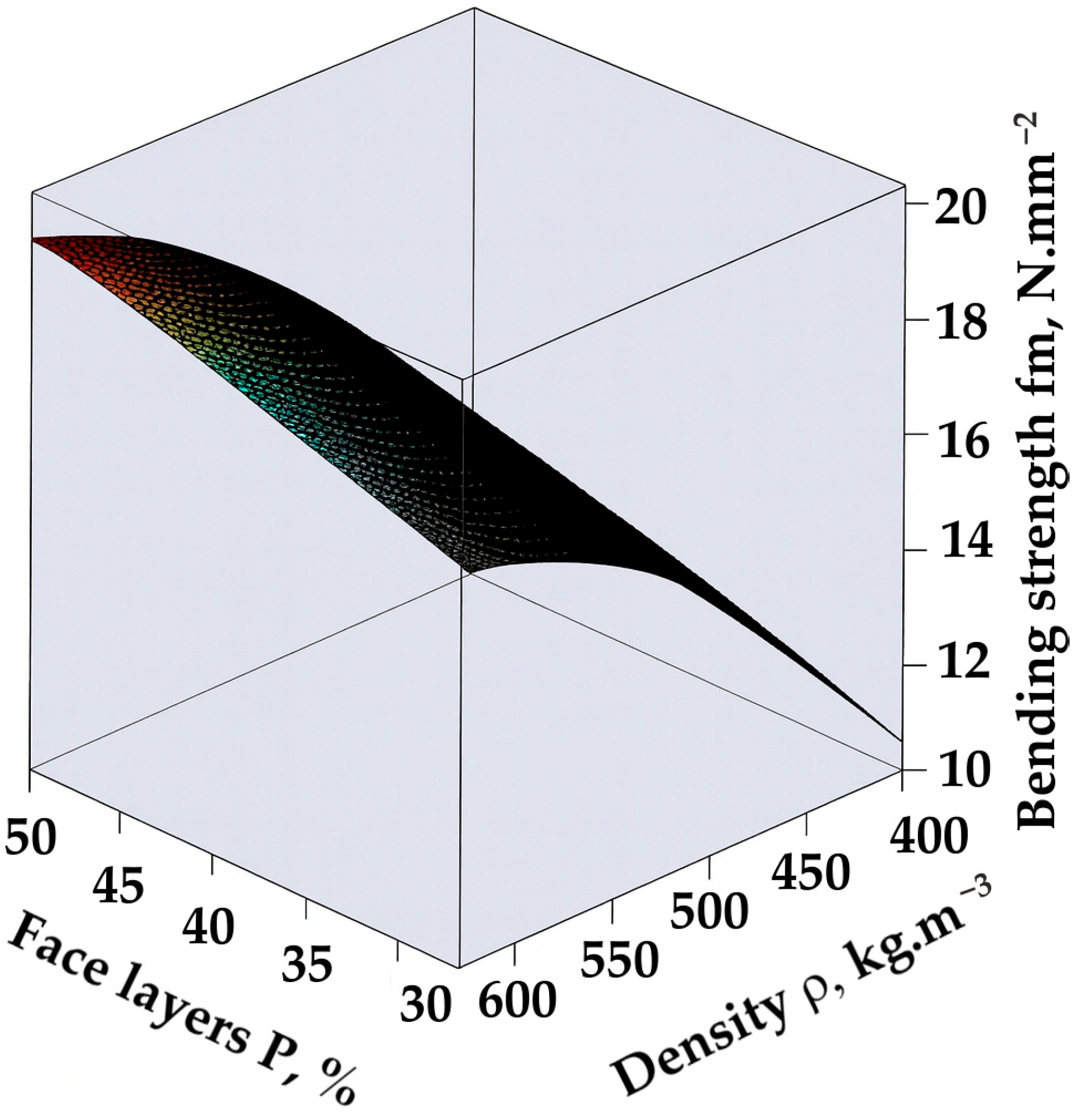 Figure 6. A clearly linear negative correlation can be observed for both studied factors. The response surface, derived from the regression model, indicates that increasing the density of the panels from 400 to 600 kg·m
