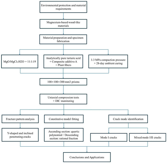 Building upon this methodological foundation, the present study provides the first comprehensive analysis of crack evolution and failure mechanisms in MWM under uniaxial compression using DIC technology. The technical process is shown in Figure 1. Our work systematically examines the load–displacement response, establishes a novel piecewise constitutive model for uniaxial compression and, for the first time, identifies and distinguishes crack initiation modes at critical locations. The findings from this investigation provide critical insights for optimizing MWM design and promoting its engineering applications in sustainable construction, particularly for conservation of timber-structured heritage, where understanding failure mechanisms is essential for structural integrity assessment.