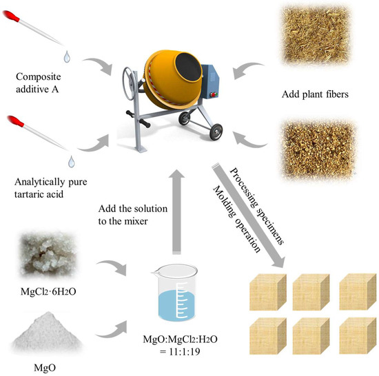 The MWM synthesis process is illustrated in Figure 2. The base formulation adopted a molar ratio of MgO:MgCl2:H2O = 11:1:19 [12,13,15,17]. Light-burned MgO powder (Liaoning source, 91.09% purity, 59.98% active content) was progressively added to industrial magnesium chloride solution (Qinghai source, 46% purity, 23°Bé). Mechanical blending using a mixer achieved homogeneous MOC paste.