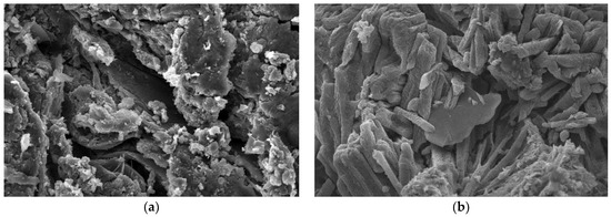 Microstructural characterization was performed via scanning electron microscopy (SEM), as shown in Figure 4. Low-magnification imaging reveals discontinuous interfacial contacts between the MOC matrix and plant fibers within the MWM, along with irregular slit-like pores. These pores likely originated from the combined action of phase-transformation stresses and moisture transport during curing. Higher-magnification observations show the interfacial transition zone features: fiber surfaces exhibit micrometer-scale topological undulations, with MOC hydration products (Mg(OH)2·MgCl2·8H2O) that are anchored within surface asperities, evidencing matrix infiltration during the rheological stage [19].
