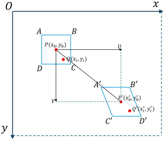 DIC was employed as the primary full-field deformation monitoring technique. This method computes displacement fields by correlating intensity distributions of sub-regions, as the reference, and deformed specimen images [30]. As depicted in Figure 5, a subset, , that is centered at deforms to with a new centroid . The displacement of any point to is defined by a first-order shape function: