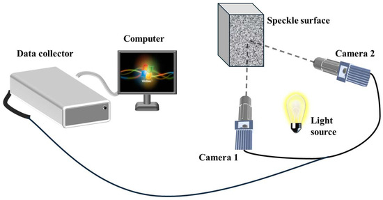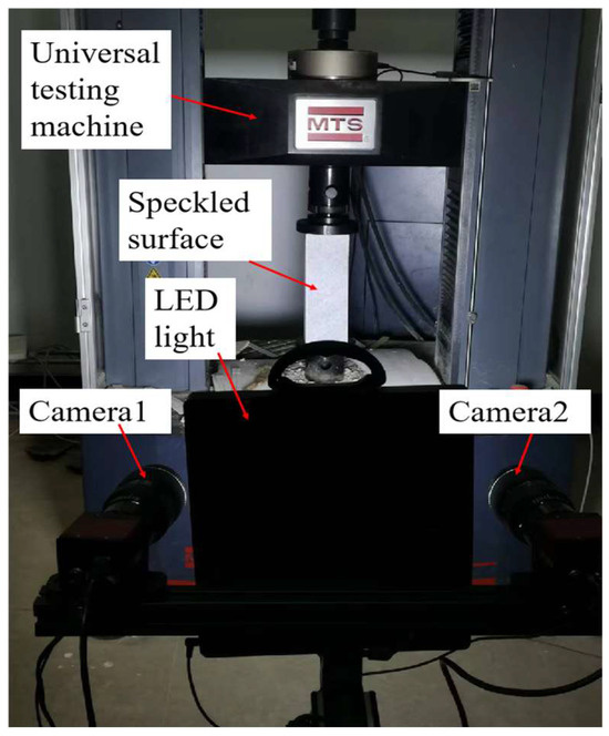 The testing system comprised an MTS electromechanical universal testing machine integrated with the aforementioned DIC system. Specimen surfaces were prepared as described in Section 2.2.1, and loading platens were cleaned to minimize frictional effects prior to testing. The experimental layout is shown in Figure 8.