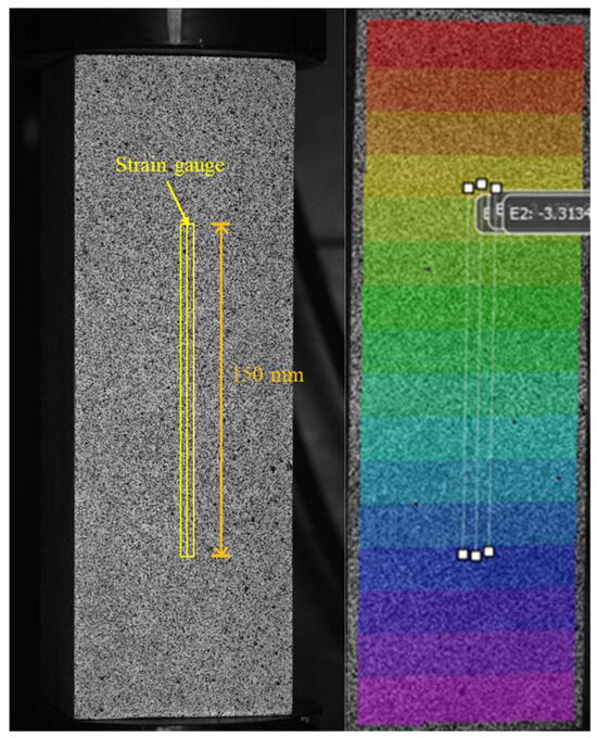The DIC setup (Figure 6) incorporated twin Prosilica GE4900 cameras (4872 × 3248 pixels) with LED illumination. A 300 × 100 mm2 region of interest (ROI) was defined at the specimen surface (Figure 7). Due to size constraints, the resolution of the ROI is approximately 3240 pixels in the vertical direction and about 1080 pixels in the horizontal direction. Images were acquired at 3 Hz and processed in VIC-3D-9 software using 29 × 29-pixel subsets with a 7-pixel step for displacement gradient calculation. The global axial compressive strains were measured via a virtual 150 mm extensometer centered on the specimen (Figure 7).