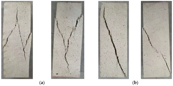During the initial loading stage, no significant changes were observed on the specimen surface. As the load continued to increase and approached the peak load, multiple discontinuous cracks, visible to the naked eye, appeared on the specimen surface. With further load increases beyond the peak load, the cracks rapidly propagated and interconnected, forming distinct inclined cracks. Subsequently, these inclined cracks continued to propagate or connect with others, ultimately penetrating through the entire specimen. An audible tearing sound accompanied this penetration failure process. Following this, axial displacement continued to increase, while the load exhibited a declining trend, culminating in the complete failure of the specimen, which fragmented into multiple pieces. Figure 9 illustrates the typical failure morphology of the MWM prism after the axial compression test. It was observed that almost no spalling occurred on the specimen surface. The main fracture pattern consisted of “Y”-shaped cracks or inclined cracks penetrating through the specimen. Failure resulted in the specimen being split into several columns, which could be completely separated.