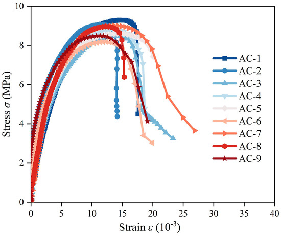 Valid data from nine specimens were collected during axial compression tests, with their complete stress–strain curves being presented in Figure 10.