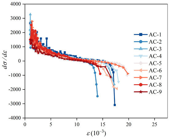 The resulting first derivative dσ/dε is shown in Figure 11. The results indicate a globally monotonic decreasing slope with accelerated decay at both ends, aligning with stress–strain curve characteristics. Using Equation (3) again, the second derivative d2σ/dε2 can be obtained. The result shows that in the initial loading stage, the second derivative fluctuates around 0, which reveals a narrow elastic deformation range—the proportional limit is merely 20~35% of the peak stress, significantly lower than concrete’s 40~50% [34].