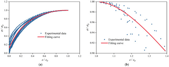 Building upon the stress–strain response and microstructural analysis, a constitutive model that accurately describes MWM’s mechanical behavior is required. Based on experimental stress–strain response data from uniaxial compression tests, this study establishes a constitutive model for MWM. Existing experimentally derived constitutive models primarily fall into two categories [37]: full-range continuous functions (e.g., Carreira D.J. model [38], Wee T.H. model [39]) and piecewise functions (e.g., Guo Z.H. model [40]). Referring to these frameworks and considering geometric curve characteristics, the MWM constitutive model is formulated as a piecewise function with a polynomial ascending branch and a rational fraction descending branch.
