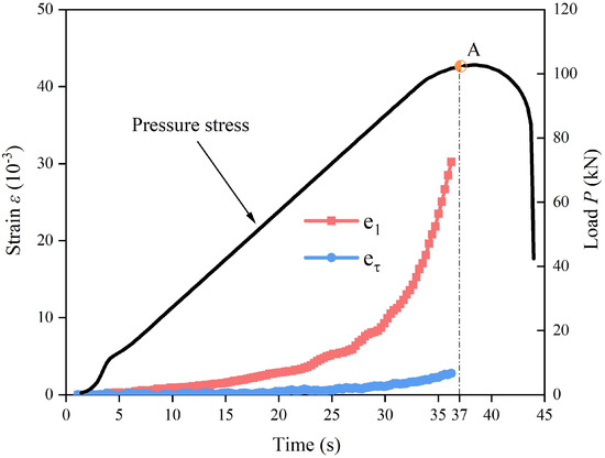The Strain Judgment Method (SJM) was employed to identify initial crack modes during uniaxial compression. Regarding AC-1, as shown in Figure 15, both the principal tensile strain and maximum shear strain exhibited negligible changes during initial axial loading. At approximately 15 s, commenced sustained growth, while remained stable. By 37 s (Point A), significant strain localization emerged at the initial cracking location (Figure 16b), indicating imminent surface cracking. Measured values reached = 0.0292 and = 0.0022. The markedly steeper slope of the -time curve compared to confirmed crack dominance by opening deformation, thus identifying a mode I crack.