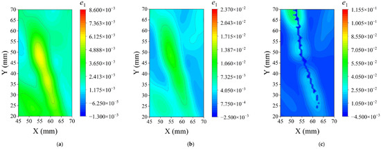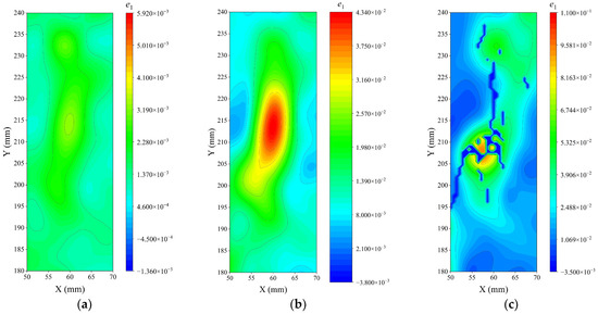 Figure 16a shows the tensile strain concentration at AC-1’s initial crack location during early loading, and the localized area was limited ( ≈ 0.0031). Notably, a light-green enveloped secondary concentration zone ( = 0.0023~0.0025) surrounded the core region. With increasing load, the strain-concentrated area expanded along the secondary zone. Immediately prior to cracking, the maximum peaked at 0.0292. Post-fracture energy release caused continued strain increases but dissipated localization.