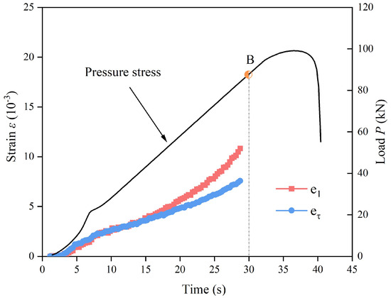 The strain–time relationship for AC-2 (Figure 17) differed fundamentally: both and increased synchronously soon after loading commenced. At 30 s (Point B), when surface cracking occurred, = 0.0106 and = 0.0079. Comparable magnitudes and slopes throughout loading indicated simultaneous normal opening and tangential sliding deformations, confirming a mixed mode I/II crack.