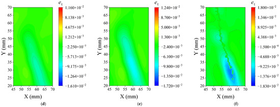Strain cloud diagrams of AC-2. (a) Principal tensile strain (loading stage, 19 s); (b) Principal tensile strain (crack initiation, 29 s); (c) Principal tensile strain (after cracking, 39 s); (d) Maximum shear strain (loading stage, 19 s); (e) Maximum shear strain (crack initiation, 29 s); (f) Maximum shear strain (after cracking, 39 s).