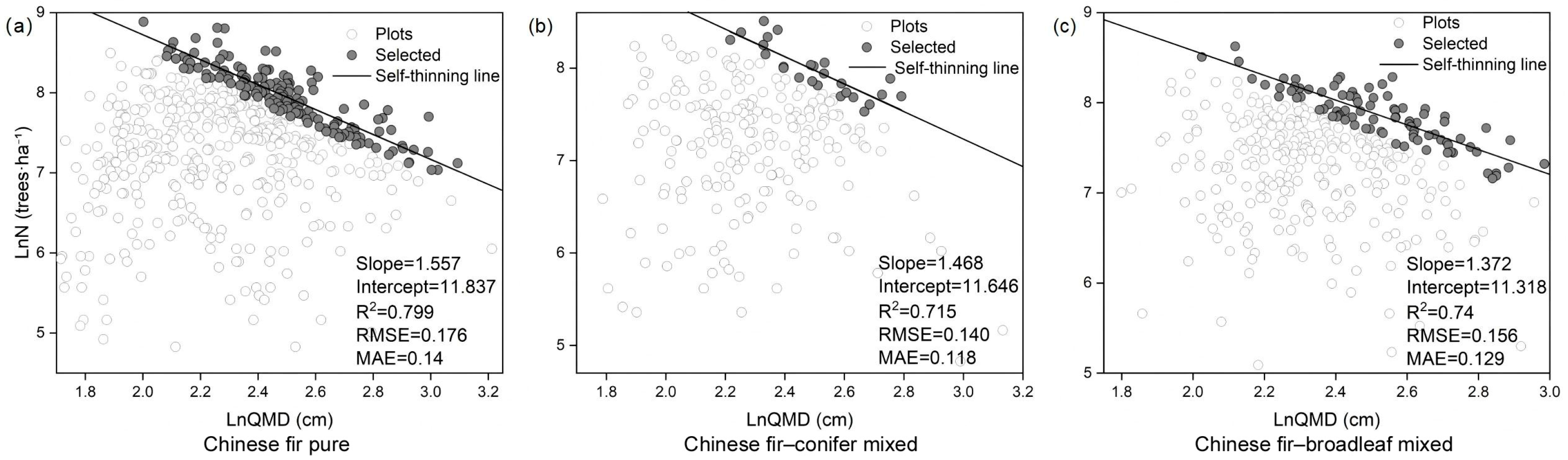 - Han, Y.; Wang, B.; Sun, H. Effects of species mixing on maximum size-density relationships in Chinese fir (Cunninghamia lanceolata (Lamb.) Hook.)-dominated mixed forests converted from even-aged pure stands. Front. Plant Sci. 2024, 15, 1342307. [Google Scholar] [CrossRef]