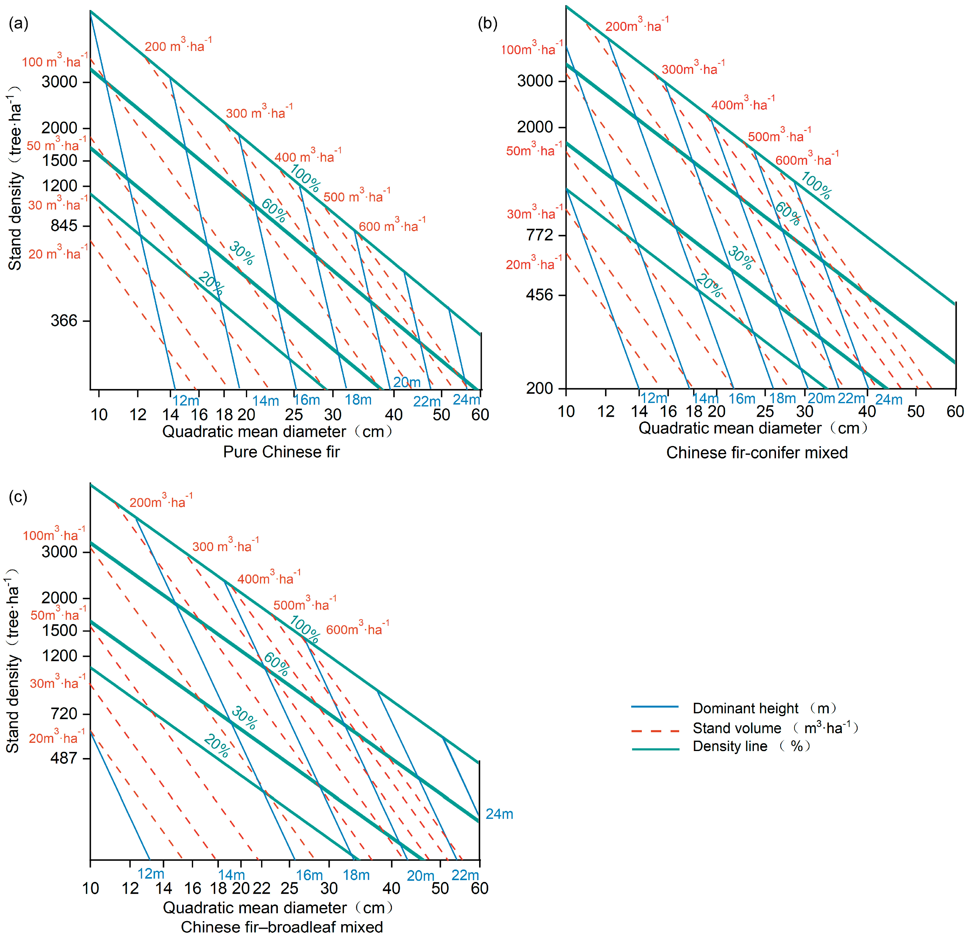 Construction of Stand Density Management Diagrams and Silvicultural Simulation for Different Stand Types of Chinese Fir in the Mid-Subtropics