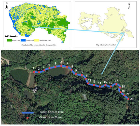 Location of Dalingshan Forest Park and distribution map of firefly observation points along the Forest Science Trail.