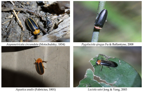 - Cao, B.R.; Yan, Z.T.; Chen, B. Checklist of Lampyridae and Rhagophthalmidae insect of China. J. Chongqing Norm. Univ. (Nat. Sci. Ed.) 2021, 5, 21–36. [Google Scholar]