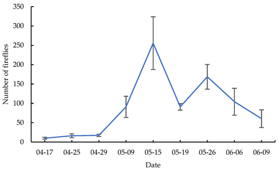 Adult fireflies on the Forest Science Trail are present from April to August. In terms of the seasonal distribution of population size: adult fireflies first appear sporadically in early April, their population size gradually increases by mid-April, reaches the peak in mid-May, maintains the peak period from mid-May to early June, slowly decreases from early June to mid-June, and then appears sporadically after mid-June, persisting until August (Figure 3).
