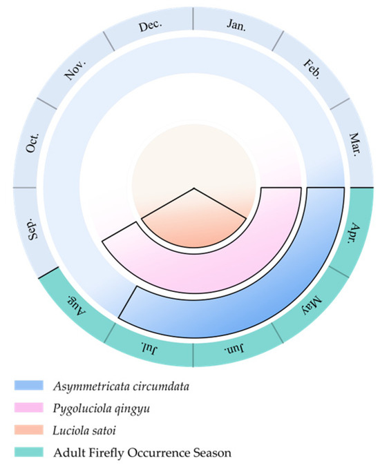 Regarding the sequential appearance of adult fireflies of different species, Asymmetricata circumdata was sporadically observed in early April, reached its peak abundance in mid-May, and became sporadic again after mid-June, with individuals persisting until mid-to-late June. Pygoluciola qingyu began to appear sporadically in early April, maintained high abundance from May to June, and gradually declined in July until August. Luciola satoi started to emerge in mid-to-late May, reached its peak at the end of May, began to decline in mid-June, and continued sporadically until late July or early August (Figure 4).
