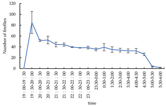 Nightly activity dynamics of adult fireflies along the Forest Science Trail. Note: Number of fireflies represents mean values averaged across all nightly time intervals from three consecutive nights of observation.