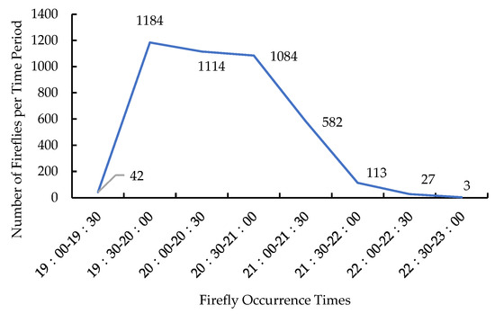 From the perspective of the peak nocturnal activity period of adult fireflies on the Forest Science Trail, the peak nocturnal activity period of fireflies is generally 19:30–21:30. Among this period, fireflies appear sporadically from 19:00 to 19:30; their population quickly reaches a peak around 20:00 and persists until 21:00. After 21:00, the number of fireflies decreases rapidly, and they appear sporadically after 22:00 (Figure 6).