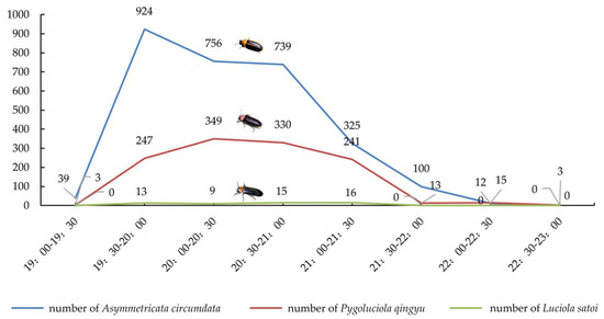 (2) In terms of nocturnal activity patterns, fireflies were observed throughout the entire night. Specifically, they began to appear after 19:00, with the peak activity period occurring between 19:30 and 20:30. While the emergence timing did not differ greatly among species, slight variations were observed in peak periods: Asymmetricata circumdata reached its peak earliest, followed by Pygoluciola qingyu and Luciola satoi. Notably, Pygoluciola qingyu exhibited a unique capacity for sustained luminescence throughout the night.