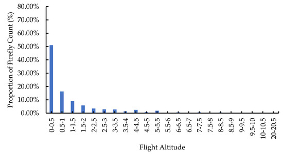 In terms of flight altitude, fireflies primarily flew within a range from near the ground up to 5 m above the surface. The majority (50.96% of observed fireflies) were recorded at heights between 0 and 0.5 m, followed by 0.5–1 m (16.29%), and then 1–1.5 m (9.12%). The proportion of fireflies observed between 1.5 m and 5.5 m was relatively low and fairly even, ranging between 1% and 4% for each interval, with even fewer individuals observed at higher altitudes (Figure 8).