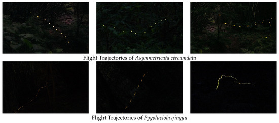 (4) The three observed species also displayed distinct flight patterns and trajectories: Asymmetricata circumdata exhibited prolonged continuous intermittent flight, while Pygoluciola qingyu and Luciola satoi displayed brief sedentary intermittent flight.