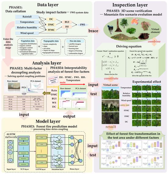 This study aims to investigate the theory concerning the role of forest influencing factors and enhance the accuracy of forest fire prediction. It achieves this by decoupling and reducing the dimensionality of environmental multidimensional variables through PCA, extracting the principal influencing factors, eliminating redundant information, and conducting forest fire predictions using the ALSTM network. This method not only reduces the time-dependence of the data but also improves prediction accuracy by creating a spatio-temporal double-decoupling effect with PCA. Subsequently, SHAP values are employed to elucidate the contributions of each feature to the model output, thereby clarifying the importance of each influencing factor in model decision-making and fire-driven effects through multiple SHAP plots. Lastly, the accuracy of the ALSTM outputs and the impact of each influencing factor on fire evolution are dynamically verified using the digital twin technique. The overall structure of this study is illustrated in Figure 1.