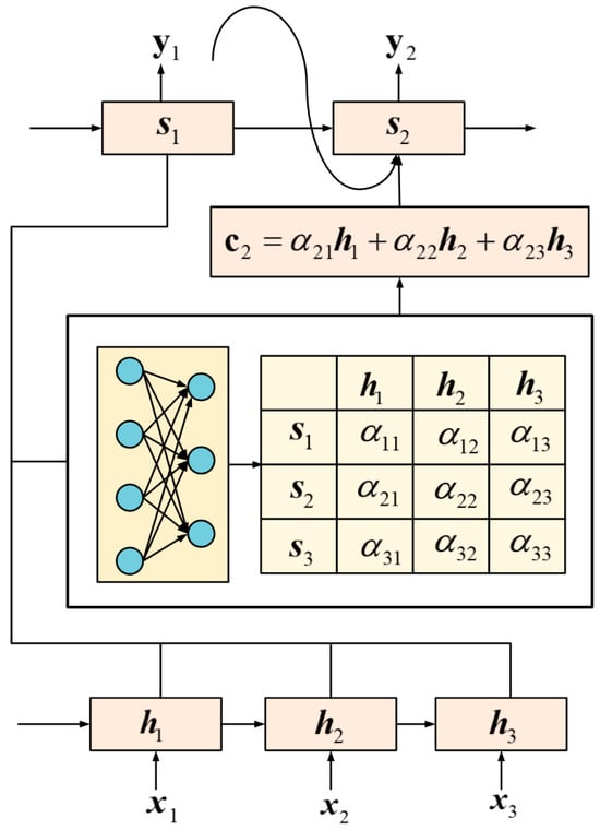 The attention module within this architecture autonomously learns attention weights, , and captures and (where , termed as the candidate state, represents the hidden state of the encoder, and , termed as the query state, represents the hidden state of the decoder, with a discernible correlation between them). Subsequently, the attention mechanism constructs the content vector , assigning more precise attention weights. These weights facilitate a more logical transition between during decoding and during encoding. The content vector represents the weighted sum of all hidden states of the encoder, multiplied by their respective attention weights, as shown in Equation (3) [77,78]: