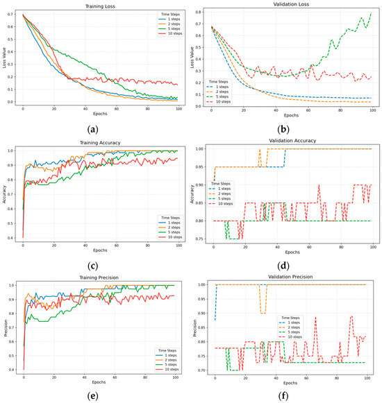 Training loss and accuracy curves for different step sizes. (a) Loss decline curve on the training set; (b) Loss fluctuation on the validation set; (c) Accuracy enhancement on the training set; (d) Accuracy metrics on the validation set; (e) Improved precision on the training set; (f) Performance of precision on the validation set.