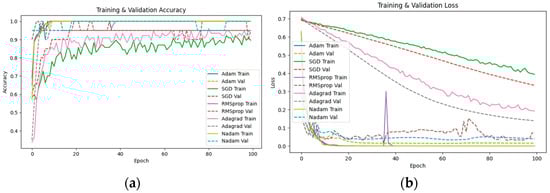 The selection of an optimizer is critical, especially in tasks requiring precision, such as forest fire prediction. In this study, five optimizers—Adam, SGD, RMSprop, Adagrad, and Nadam—were evaluated using the same PCA dimensionality reduction dataset (Figure 5 and Table 3).
