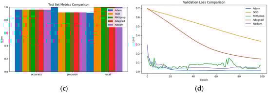 Comparison of training results of five optimisers. (a) Training and Validation Accuracy; (b) Training and Validation Loss; (c) Test Set Metrics Comparison; (d) Validation Loss Comparison.