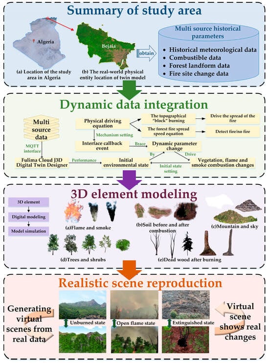 - Huang, Y.; Li, J.; Zheng, H. Modeling of Wildfire Digital Twin: Research Progress in Detection, Simulation, and Prediction Techniques. Fire 2024, 7, 412. [Google Scholar] [CrossRef]