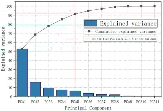 PCA effectively decreases the number of variables within the dataset while preserving essential information, such as dominant trends. The determination of the number of PCs in this study was based on cumulative variance contribution rates [72]. In practical applications, an empirical threshold of 80%–90% is commonly employed for PC selection. Given the stringent requirements for data integrity and reliability in subsequent modeling and parameter optimization stages, a cumulative variance contribution threshold of 90% was prioritized to ensure the retention of critical information and to enhance computational accuracy. Following the PCA, the cumulative variance contribution of the first five PCs reached 91.40%, indicating that these components collectively accounted for over 90% of the variance present in the original dataset. Consequently, the first five principal components (PCs) were utilized as a secondary dataset (herein referred to as the “PCA dataset”). These PCs constituted a compressed yet representative dataset.