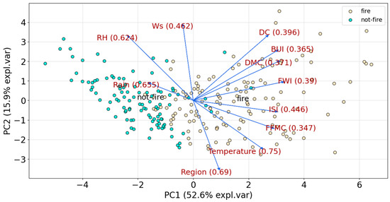 To accurately predict the likelihood of forest fires in a given area, it is imperative to identify the factors that contribute to fire occurrence, such as climate, terrain, and fuel conditions [7,8,9]. Understanding the relationship between these factors and the probability of fire is crucial [10]. These elements, often termed impact factors, significantly impact both the incidence and propagation of forest fires. Meteorological factors are critical determinants [11]. Given this context, the study utilizes a publicly accessible dataset of Algerian forest fires [12] to explore the dynamics of key meteorological factors—such as temperature, humidity, and ambient winds—during forest fire combustion. Additionally, the study reevaluates the physical significance of extended state indicators, including the Fine Fuel Moisture Code (FFMC), Duff Moisture Code (DMC), and Drought Code (DC).